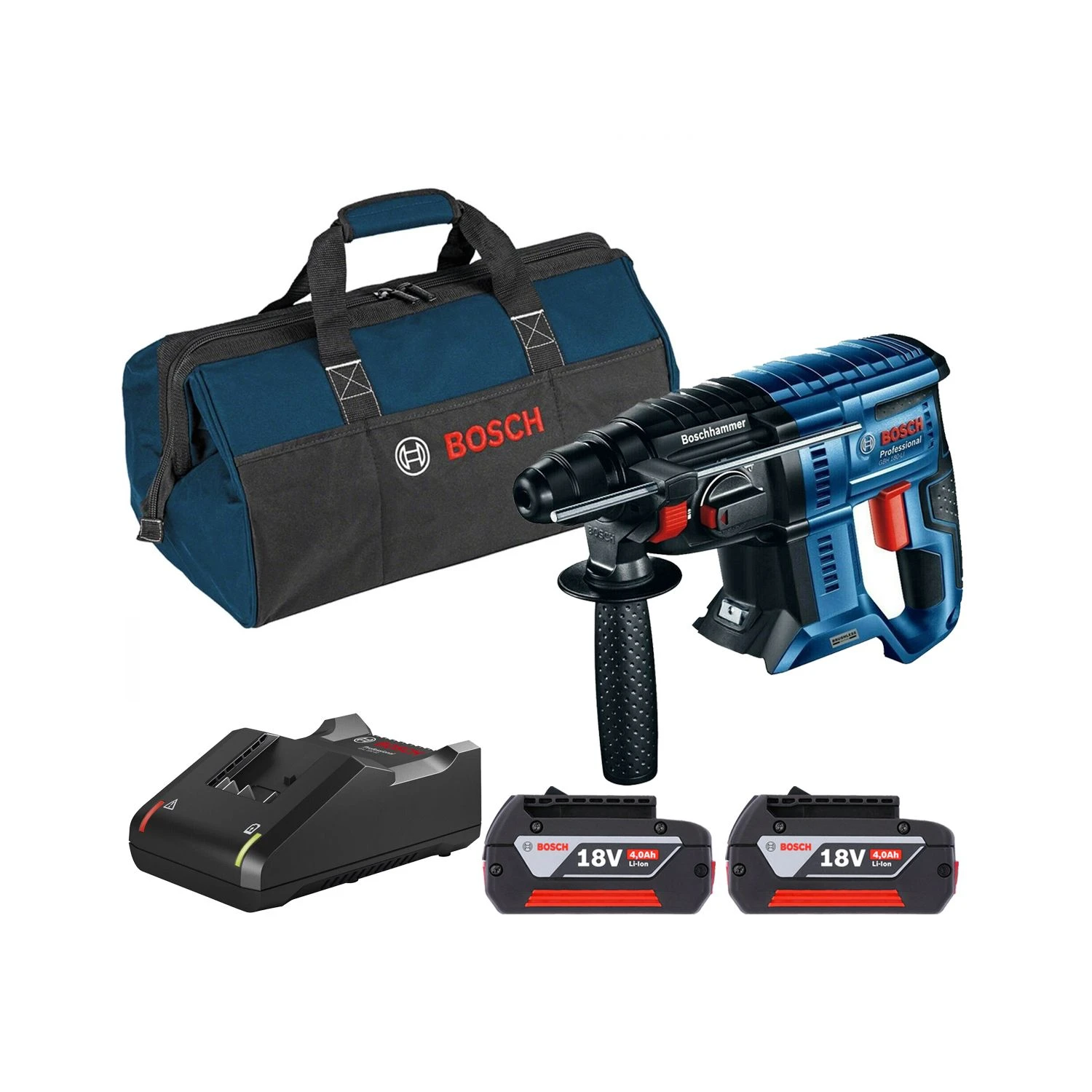 Bosch GBH 18V-21 18 V Cordless Brushless SDS Plus Rotary Hammer Drill With Two 4.0Ah Batteries, Charger And Tool Bag