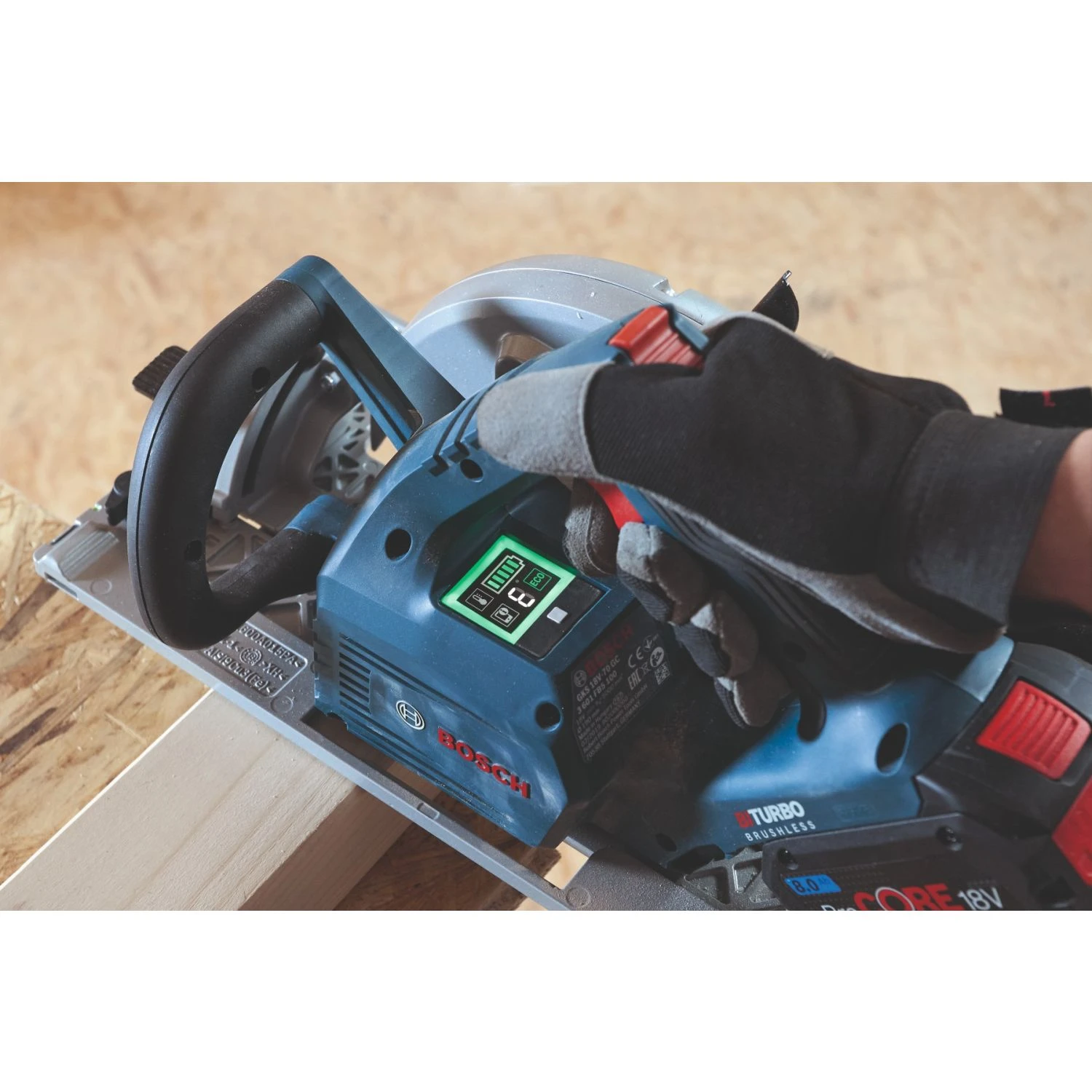 The Bosch 06016B5170 GKS 18V-68 GC Circular Saw is a cordless saw that provides users with the equivalent power, performance and handling of an 1800W corded tool, thanks to its BITURBO Brushless technology. The auxiliary handle ensures ergonomic comfort and perfect control is maintained throughout all cutting positions. The depth adjustment is comfortable and intuitive. The saw delivers 2,500 – 5,000 rpm, and is ideally suited for both DIY enthusiasts and trade professionals.