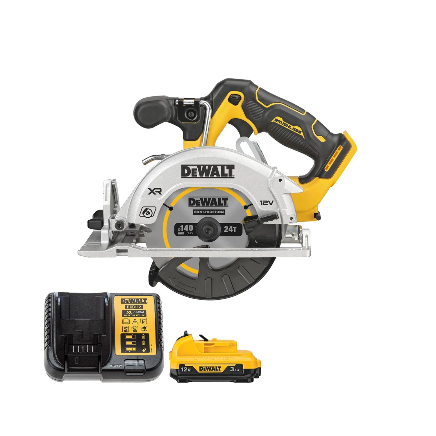 The DeWalt DCS512N 12v XR Brushless Circular Saw is a powerful efficient tool with excellent runtime and unbeatable performance. It features a Direct AirLock Dust Port for a cleaner and safer job site. There is space for onboard tool storage, and blade changes can be undertaken quickly and efficiently. The blade is Tungsten Carbide topped, 140mm in diameter and featuring 24 teeth. The saw has an integrated LED work light which can be targeted to illuminate the cutting line. The electronic brake ensures the blade can be stopped quickly. The incorporated rafter hook allows the saw to be hung from the rafters, creating more storage whilst working. Ideal for professional and DIY use.