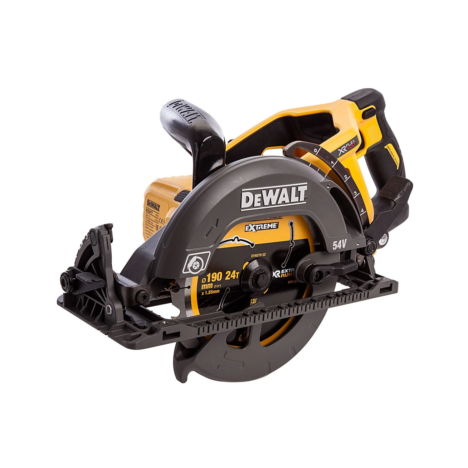 The Dewalt DCS577 XR Flexvolt High Torque Circular Saw is part of the XR Flexvolt platform offering unrivalled run-time and performance. Heavy-duty construction applications can be completed without the need for mains power. Its high torque brushless motor delivers up to 5800rpm of power, perfect for first fix applications. The diamond bore drive system transmits the generated high torque more effectively, delivering superior performance and faster cuts. The gearbox and blade guard are made from robust aluminium for greater durability.