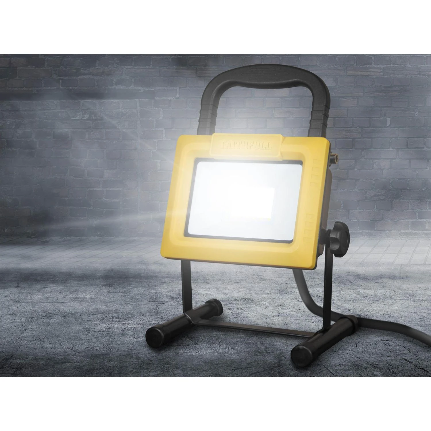The Faithfull SMD LED Pod Site Light features the latest LED lighting technology and is designed for both commercial and domestic use. The head contains an SMD LED unit that provides a high light output of 3600 lumens. SMD LEDs are maintenance free and more resilient to impact damage that can cause conventional halogen tubes to fail if a light is hit or knocked over. LEDs have the added advantage of a low power consumption and a cool running temperature that avoids the burn hazards commonly associated with halogen lighting. Ideal for indoor and outdoor use, the slim and lightweight die-cast aluminium lamp head is IP44 rated for water and dust ingress protection. The impact resistant glass lens makes the site light a durable solution. The lamp head is fully adjustable and features a 180° foldable handle. Supplied with 1.5m of cable, fitted with an appropriate approved BS plug.