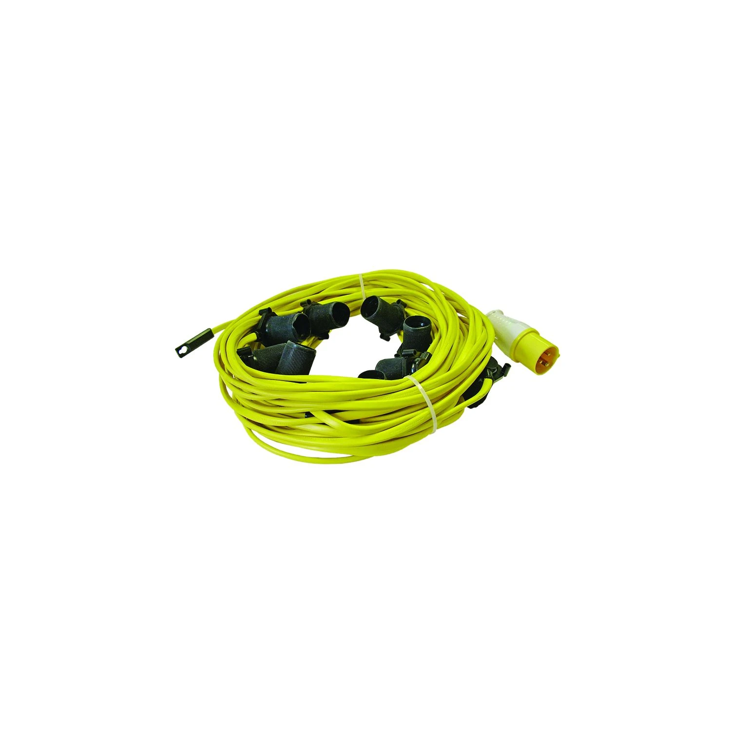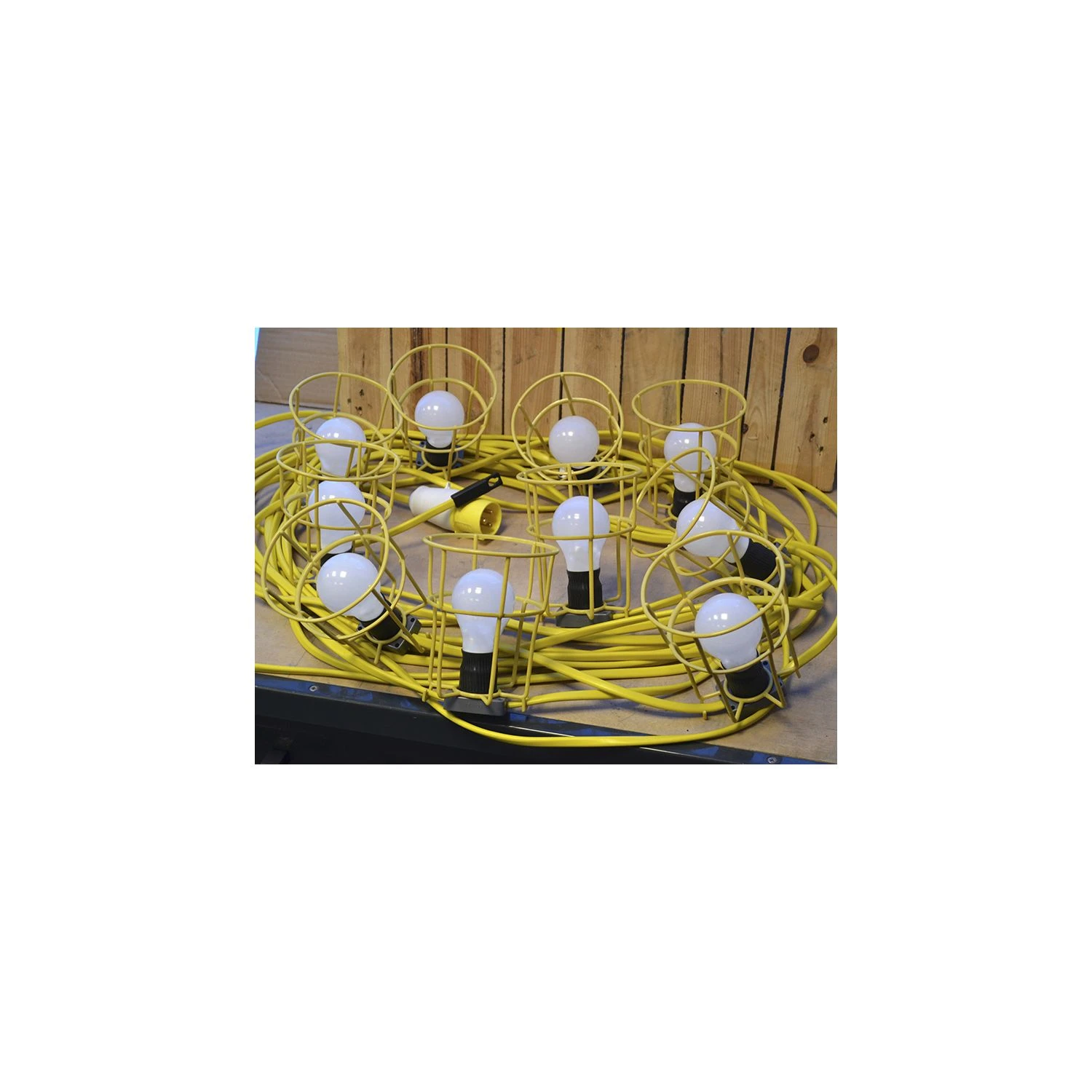 The Faithfull Festoon Light Set, comes on a 22 metre arctic cable supplied with 10 x ES GLS rough service bulbs (110V), each bulb is protected by a lightweight yellow plastic cage. These festoon lights will provide a very effective solution to illuminating a large area on site by hanging the lights in one room and to another across a landing, etc.