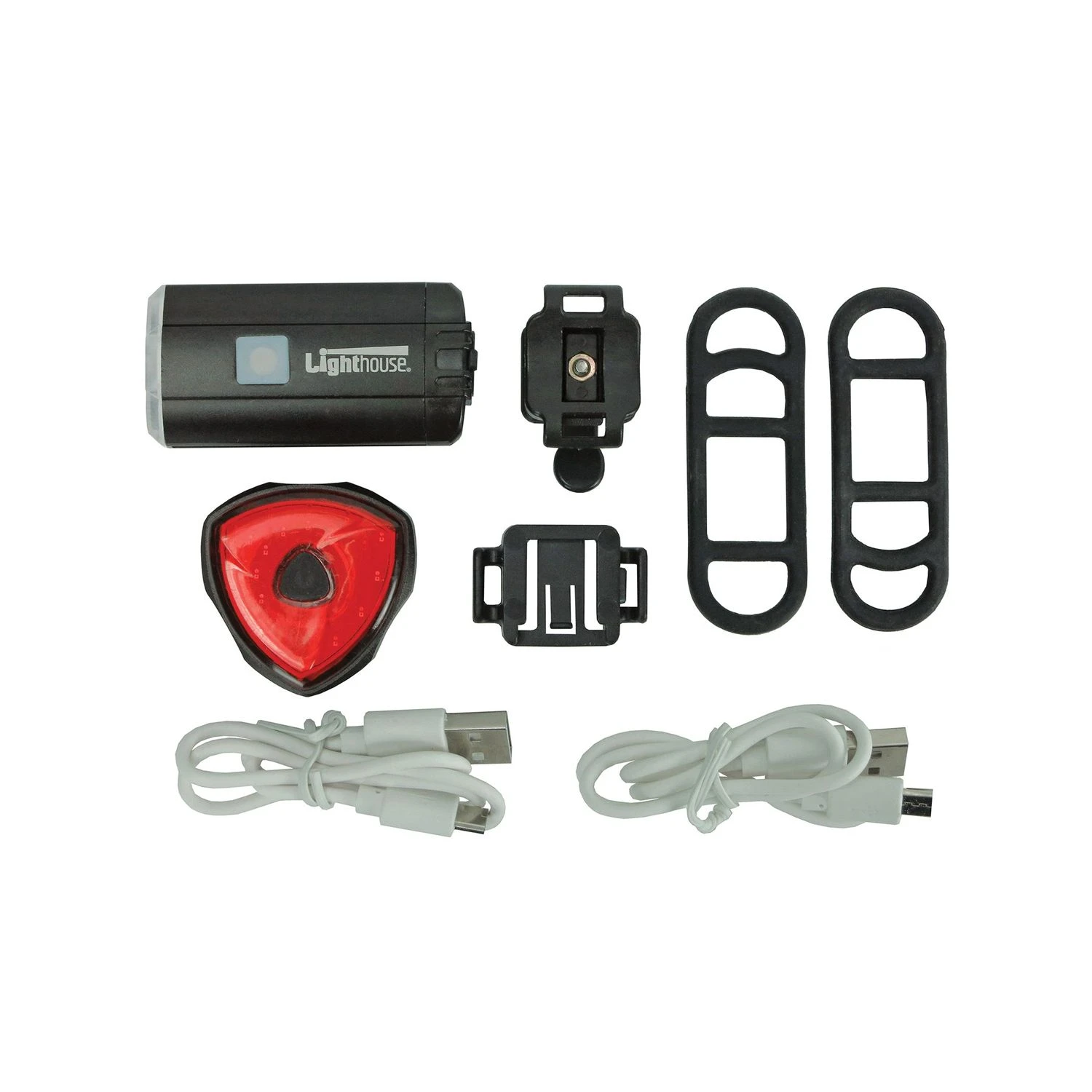 The Lighthouse Elite Rechargeable LED Bike Light Set utilises the latest technology in portable lighting, allowing extremely bright LED lights to be encased in lightweight and compact units. The front light features 3 light settings: high 100%, low 50%, strobe. Whilst the rear light has 6 settings: high, medium, low, fast flash, slow flash, strobe.The bike light output modes are controlled by a sequential switch. Press and release the button to switch between modes. Hold the button down for 3 seconds to turn the lights off. Rechargeable, can be charged via any USB port with the supplied cable.