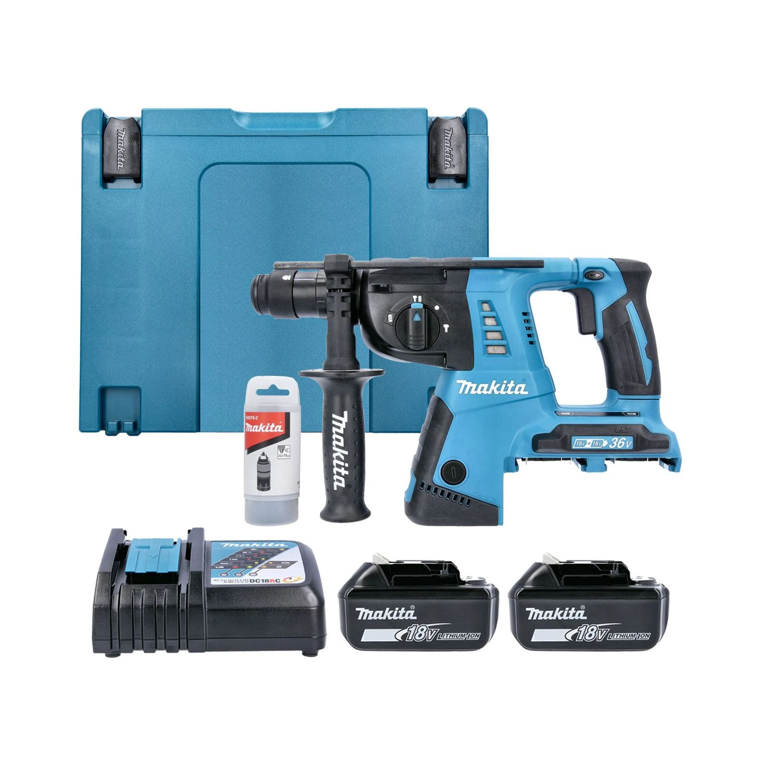 The Makita DHR264Z is a 26mm cordless SDS+ plus rotary hammer drill based on model BHR262T but powered with 2x 18v batteries giving the equivalent power of a 36v machine. Also comes with a quick change chuck to allow for the use of standard straight shank drill bits.