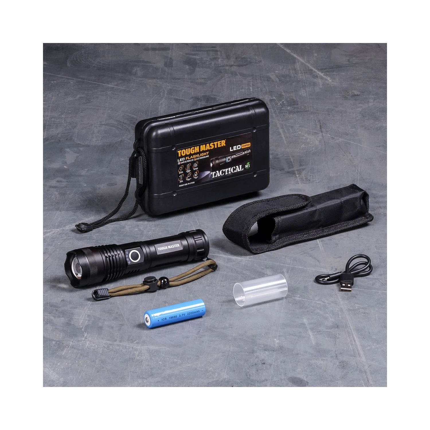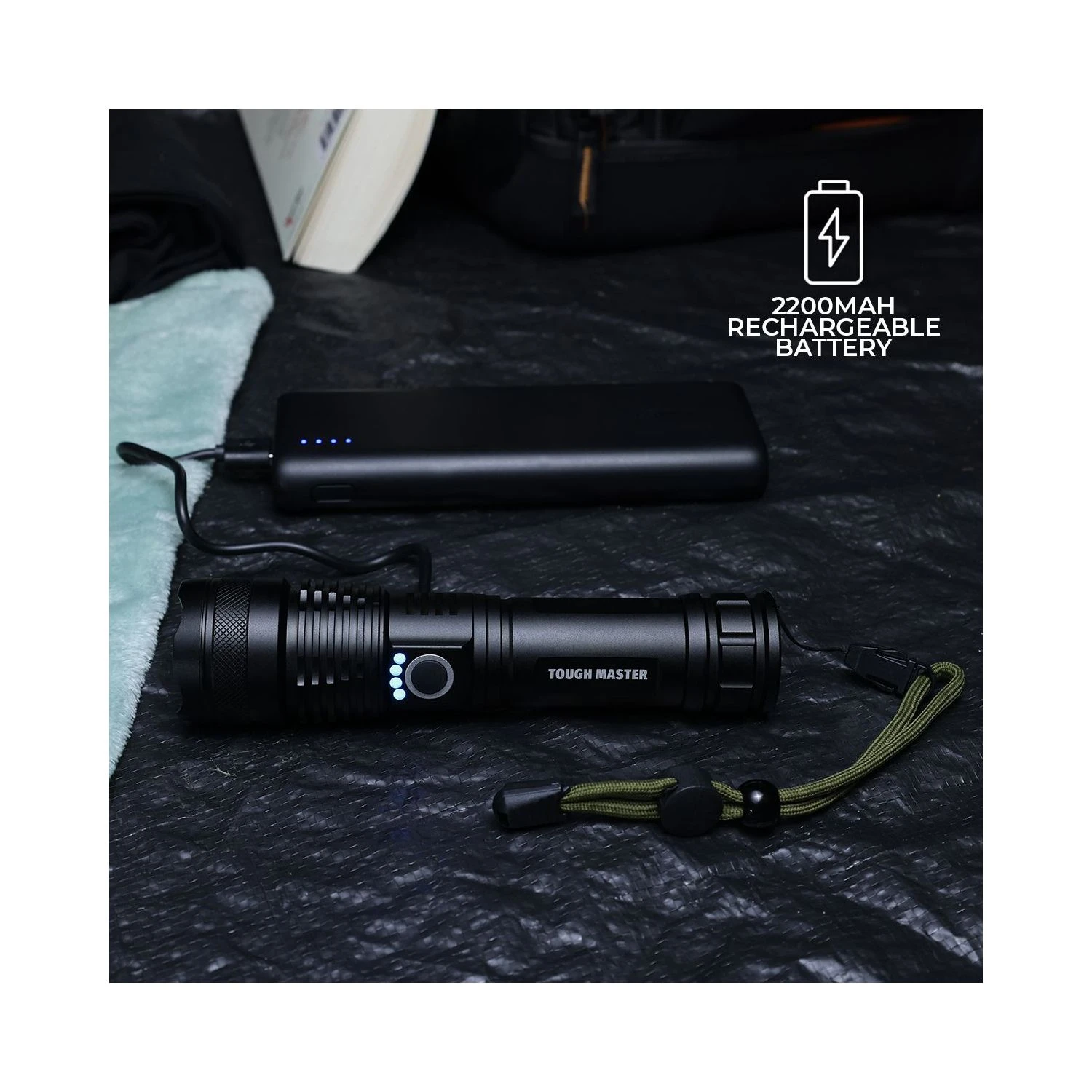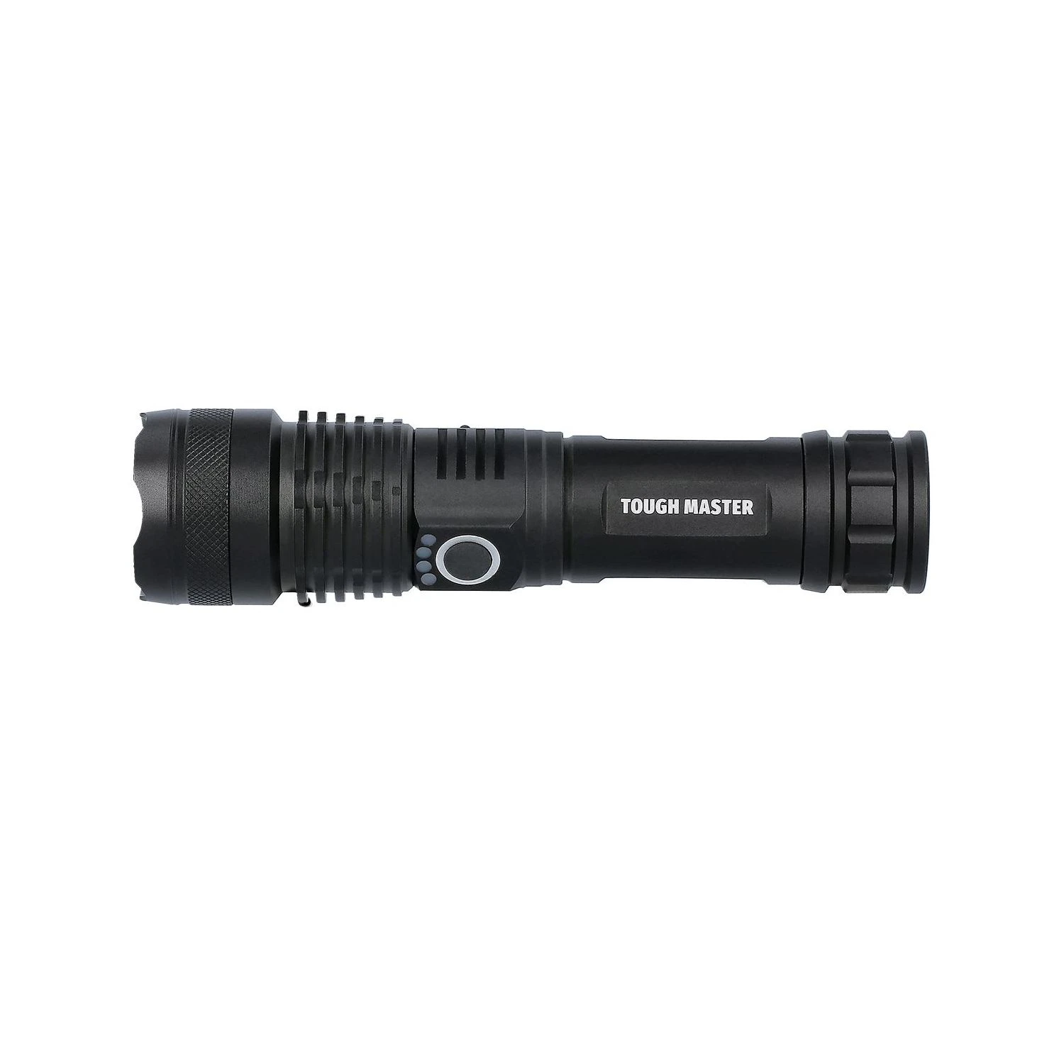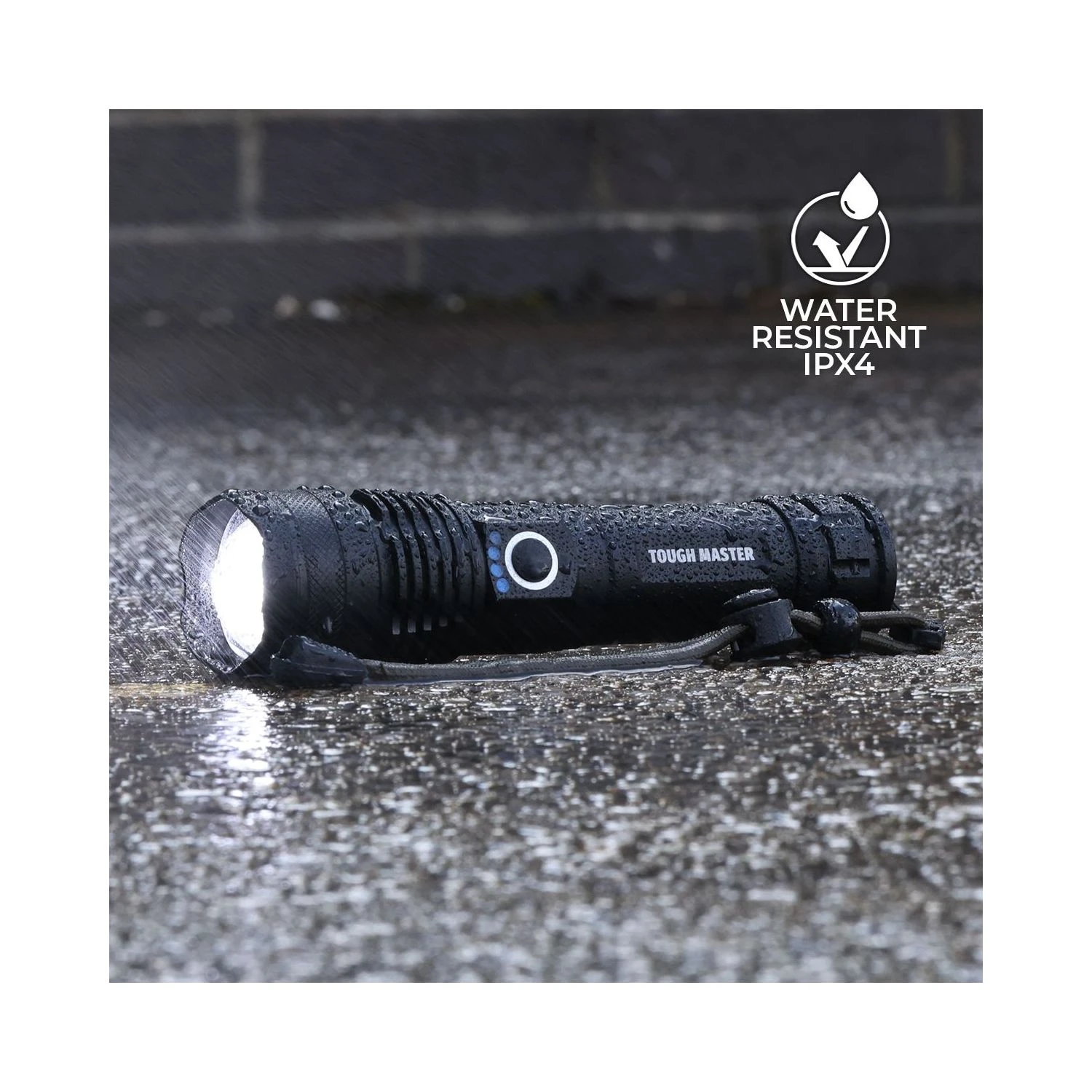 Looking for a powerful mini torch, one that’s also a USB rechargeable torch? TOUGH MASTER® has it right here: The TM-LTF1200 is a 1200-lumen rechargeable torch that can easily light up a 100m² room and can throw a beam over the length of about 2 football fields (200m). Its powerful LED beam can be widened to illuminate a larger area or focused to project a spotlight. Thanks to its 5 beam settings high, medium, low, strobe and SOS you’ll never be without the right amount of light. Fully press to switch on and off and half-press to cycle through lighting modes (a rapid off-on press also cycles lighting modes). This rechargeable LED Torch has a highly durable design, too. Its IPX4 rating means that it’s splash-resistant. Because it’s made from military-grade aluminium, it’s strong enough to survive a 3m drop. We’ve included a standard USB cable, so that you can connect your rechargeable torch light to laptops, car chargers and power banks. There are 4 blue LED indicator lights on the torch to let you know whether the battery is 100% / 75% / 50% / 25% charged. This USB rechargeable torch has a run-time of 3.5 hours (in low-beam setting), giving a steady light from the included rechargeable 1200mAh battery. When not in use, this torch easily fits in your pocket, tool bag or toolbox for easy storage and quick access. This torch set includes: rechargeable torch with wrist strap, plastic storage case, battery (1200mAh), USB cable, battery tube and fabric torch pouch. Whether you’re inspecting pipework, ductwork or repairing a vehicle, you’ll want to keep this rechargeable torch light with you.
