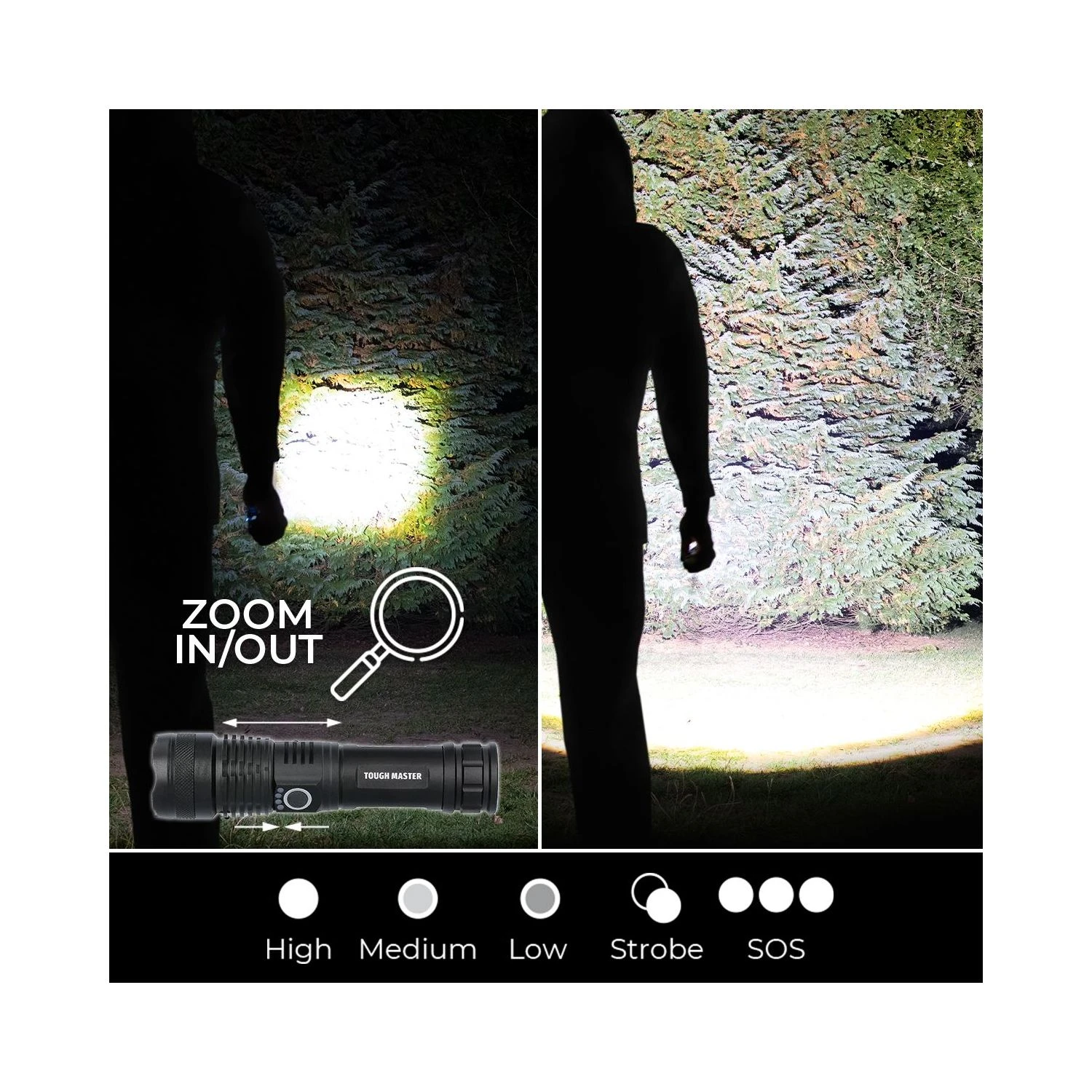 - Adjustable Focus & 5 Lighting Modes: The powerful LED beam for this rechargeable USB torch illuminates a large area or can adjust to project a perfectly focused spotlight. It has 5 settings: High, Medium, Low, Strobe, SOS. Fully press to switch on and off and half-press to cycle through lighting modes (a rapid off-on press also cycles lighting modes). This USB rechargeable torch is convenient to use as well as versatile