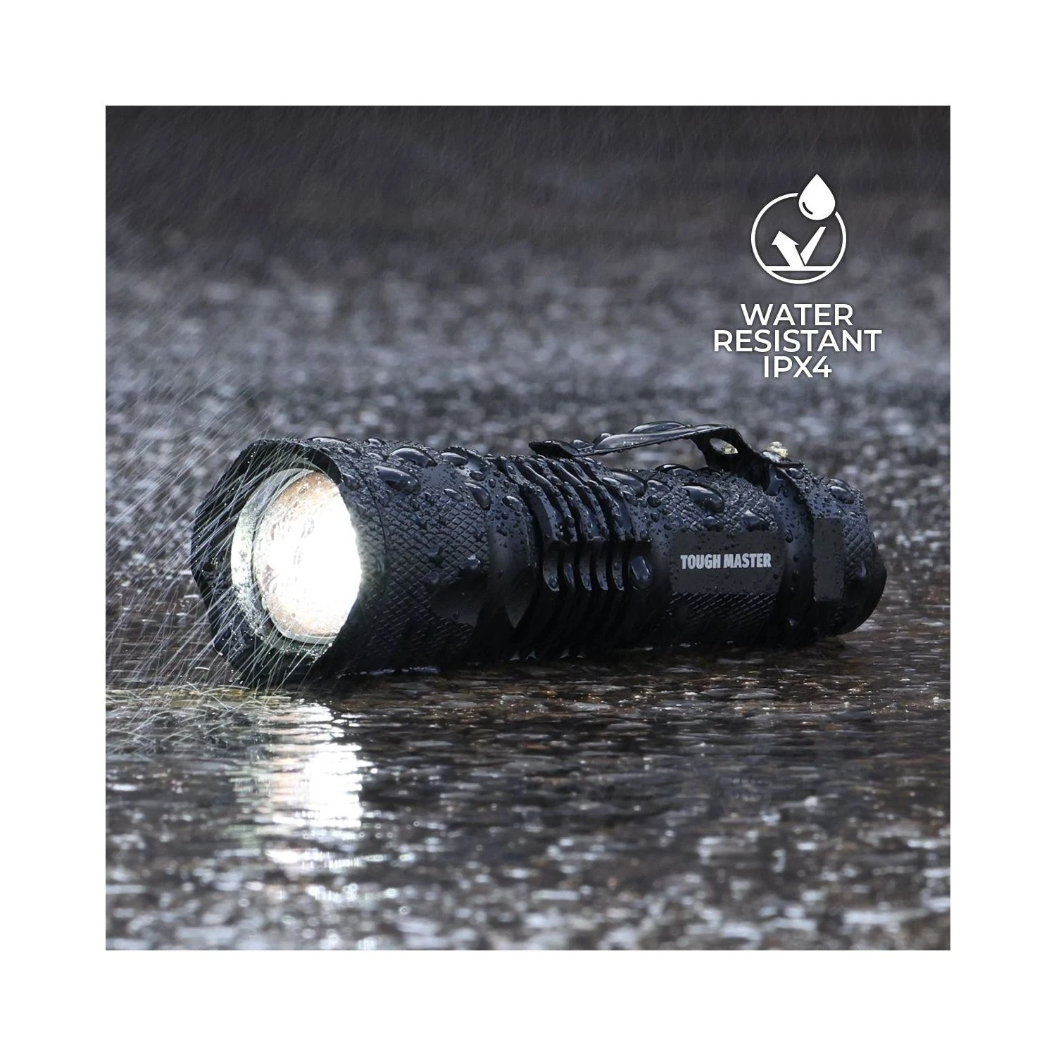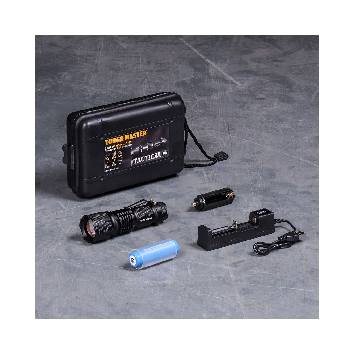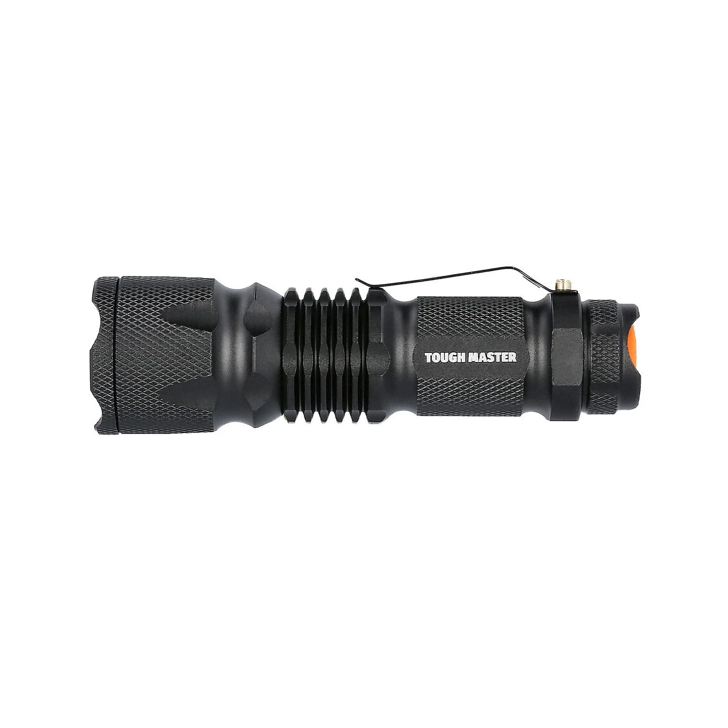 Brighten up your workspace with the TOUGH MASTER® Rechargeable LED Torch. This super bright flashlight is equipped with an L2 core chip to provide 800 lumens of light, allowing you to see up to 200 metres away – that’s two football pitches of visibility! It’s also 10 times brighter than classic incandescent lights, so if you’re in need of an upgrade, we’ve got you covered. And if you’re after a handheld flashlight that lasts, you’re in for a treat: The TM-LTF400 is made from military-grade aluminium, which is a highly durable material that can survive a staggering 3-metre drop. There’s even the option to adjust your focus with this LED flashlight, so you can keep the spotlight concentrated on a specific point to see it clearer. With 5 lighting modes (High, Medium, Low, Strobe & SOS), the choice is in your hands, as you can pick which mode is convenient to you depending on your task and level of visibility. What’s more, the original battery on this high power beam flashlight can last up to 5 hours on low-beam mode before it needs recharging, and it won’t diminish in brightness during this time, either. The lumen flashlight can also be powered with AAA batteries (not included), which is great news if you forget to charge your rechargeable one. This waterproof LED flashlight has a pocket-friendly belt clip to make it easy to carry around and is value for money too; with the torch, plastic case, 1200mAh battery, USB battery charger, battery tube and battery adaptor all included.