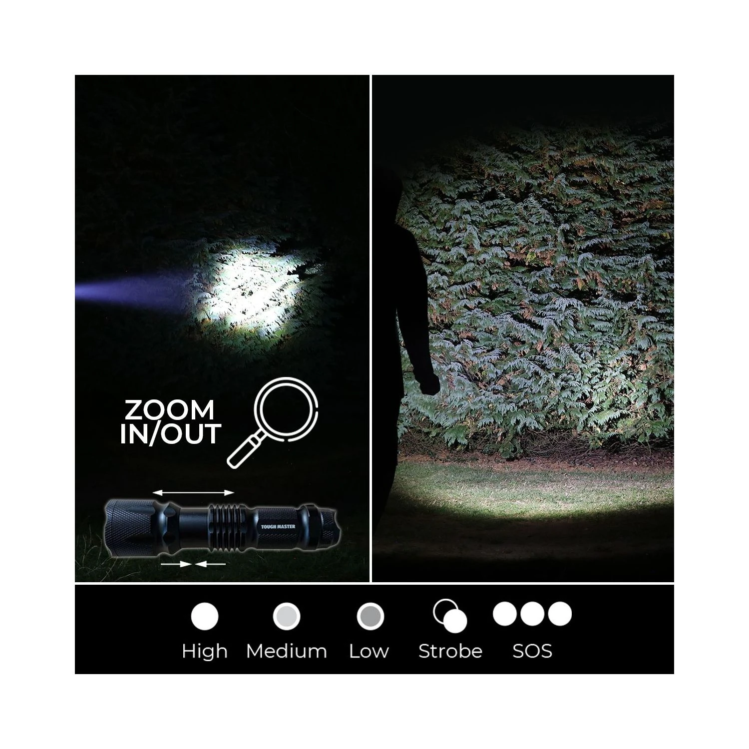 - Adjustable focus & five lighting modes: This high power beam flashlight allows you to adjust your focus to keep the light focused on a specific point for the best possible view. Zoom in or out depending on your requirements. Take your pick of its 5 lighting modes: High, medium, low, strobe & SOS.