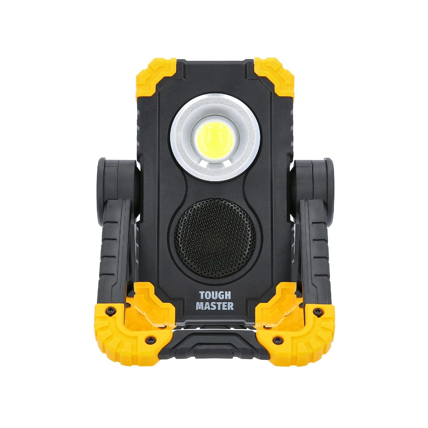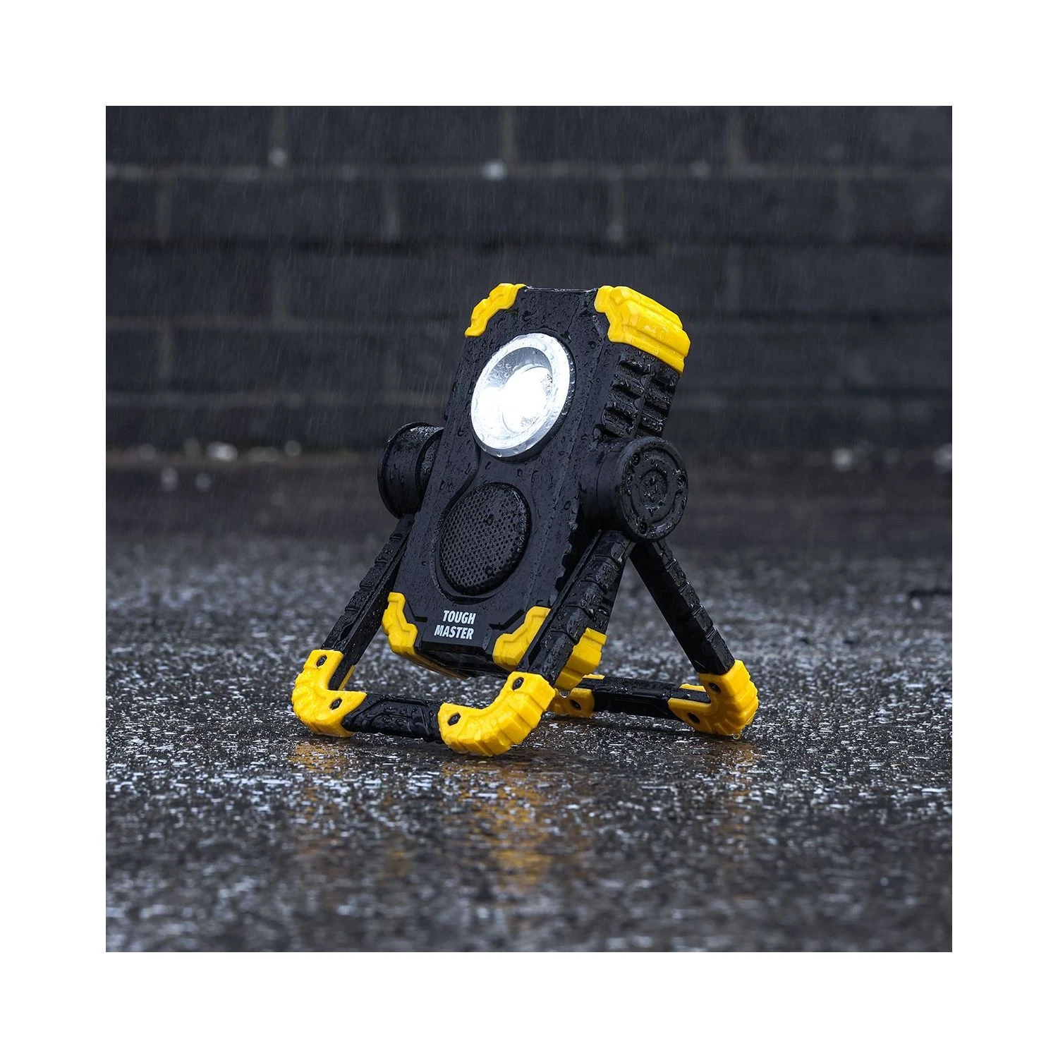 Make light work of your tasks with this rechargeable wireless speaker work light from TOUGH MASTER®. Our work lights use only high-quality chips, so you’re guaranteed high performance and durability. The 10W COB LED lights for this work light with speaker can produce up to 1500 lumens and a beam length of about 100 metres. The durable LEDs won’t need to be replaced. This work light with Bluetooth speaker has 3 lighting modes: high, low and strobe, which is useful for emergencies. The housing for this work light with speaker is made from high-quality TPR plastic and has sturdy corner protectors for added durability. The IP44 splash-proof rating ensures this LED work light with speaker can be used in the rain. Thanks to the work light’s integrated 5W Bluetooth speaker system, you can listen to your favourite music or radio station: Just connect wirelessly to your laptop, smartphone or tablet to stream music or other audio content. With its foldable design, it’s easy to set up for any activity, work or play. This rechargeable work light with Bluetooth speaker has a 5000mAh battery, and can be fully recharged in 3–4 hours. This work light will operate on high brightness setting for 4 hours and for up to 15 hours on low brightness setting. You can also use this work light with speaker as a power bank: Just plug in the included USB cable and charge or power your device. The 360° rotation for this LED work lamp gives you powerful lighting in any direction.